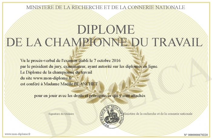 Envoyez par email votre Diplôme de la championne du travail personalisé