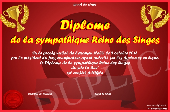 Envoyez par email votre Diplôme de la sympathique Reine des Singes personalisé