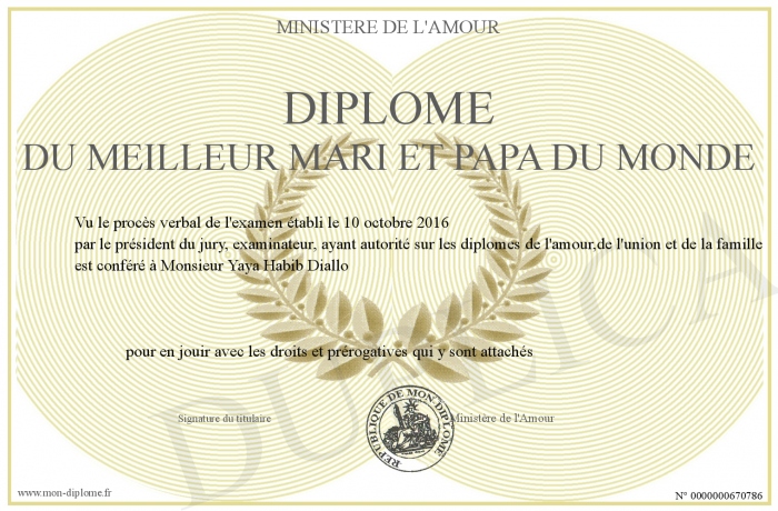 Envoyez par email votre Diplôme du Meilleur Mari et Papa du Monde personalisé