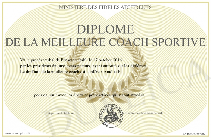 Envoyez par email votre Diplôme de la meilleure coach sportive personalisé