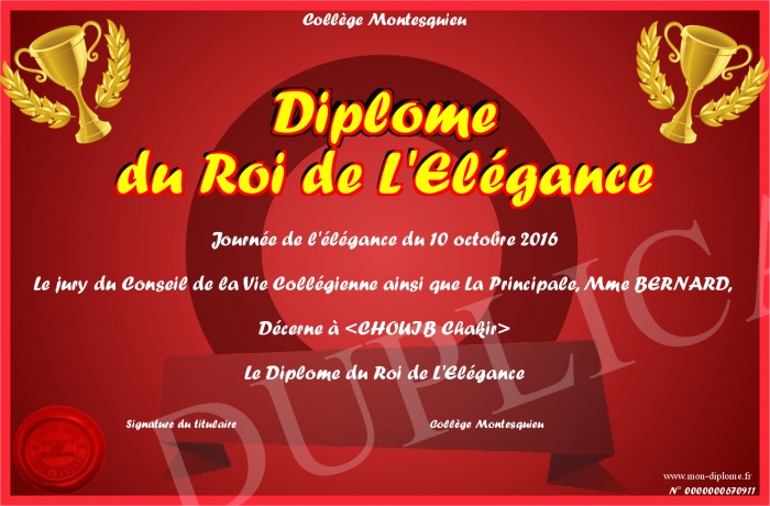 Envoyez par email votre Diplôme du Roi de L'Elégance personalisé