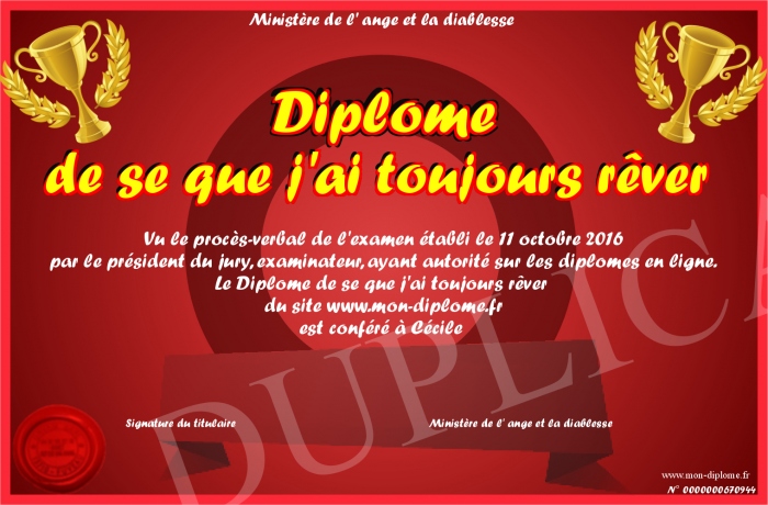 Envoyez par email votre Diplôme de se que j'ai toujours rêver personalisé