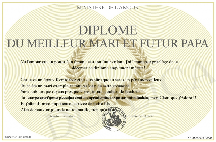 Envoyez par email votre Diplôme du meilleur mari et futur papa personalisé