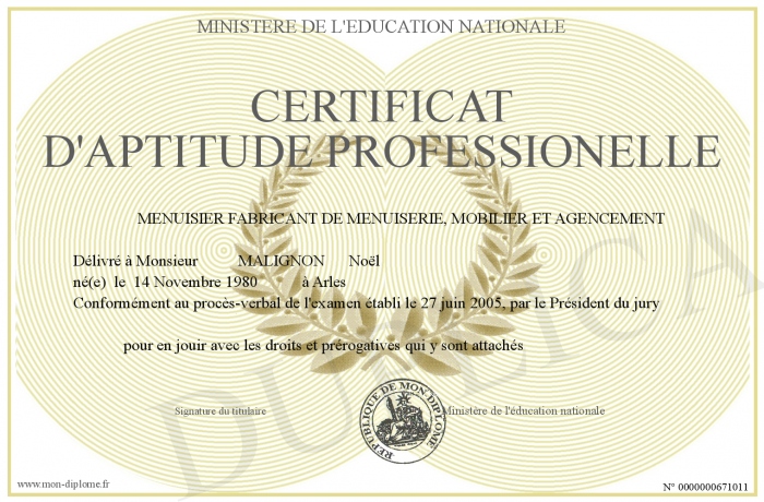 Envoyez par email votre CERTIFICAT D'APTITUDE PROFESSIONELLE personalisé