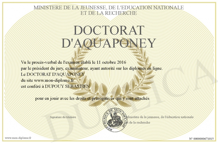 Envoyez par email votre DOCTORAT D'AQUAPONEY personalisé