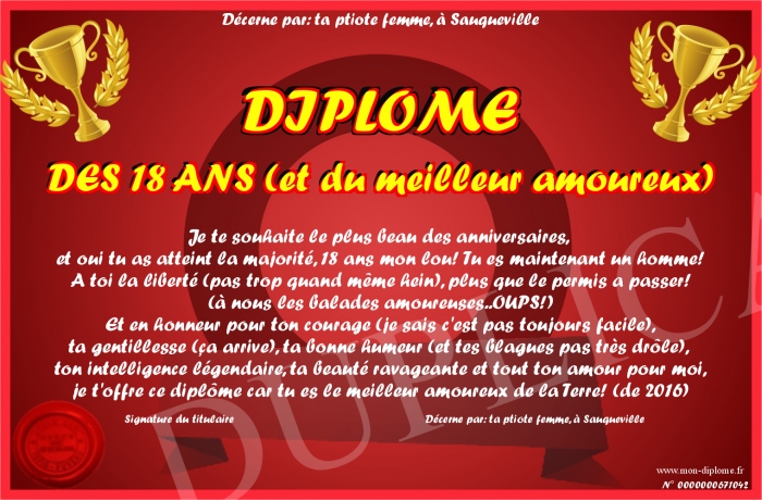 Envoyez par email votre DIPLOME DES 18 ANS (et du meilleur amoureux) personalisé