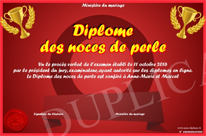 Envoyez par email votre Diplôme des noces de perle personalisé