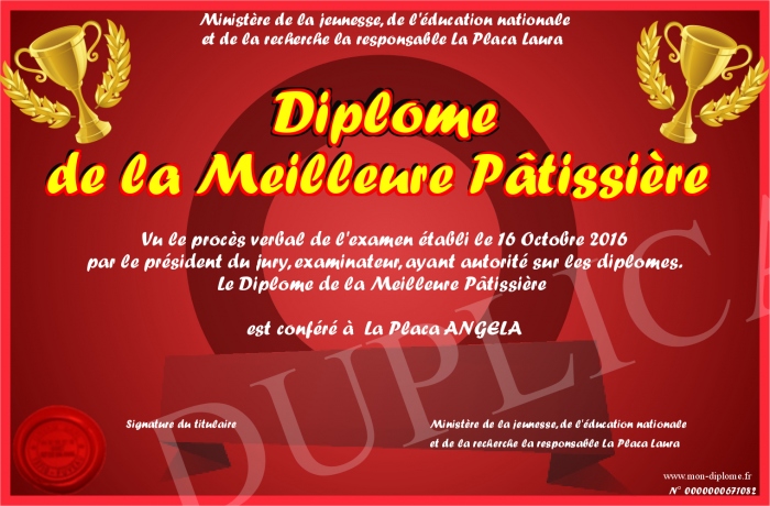 Envoyez par email votre Diplôme de la Meilleure Pâtissière personalisé