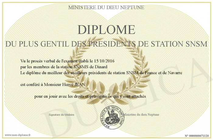 Envoyez par email votre Diplôme du plus gentil des présidents de station SNSM personalisé
