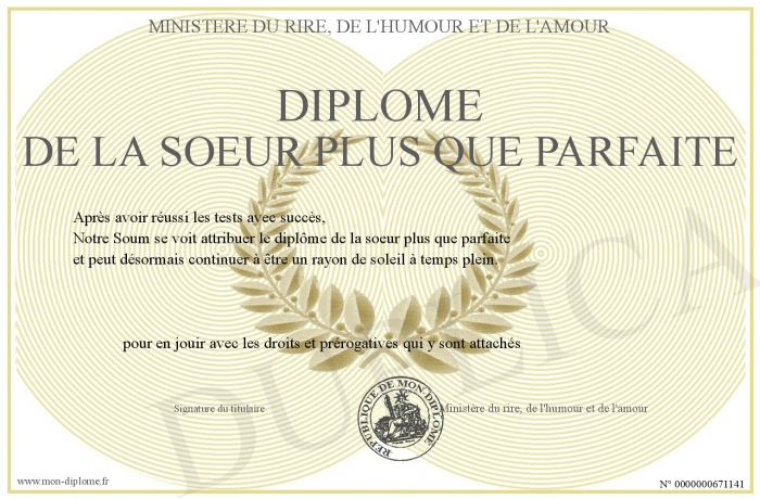 Envoyez par email votre Diplome de la soeur plus que parfaite personalisé
