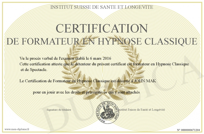 Envoyez par email votre Certification de Formateur en Hypnose Classique personalisé