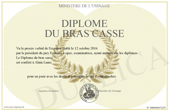 Envoyez par email votre Diplôme du bras cassé personalisé