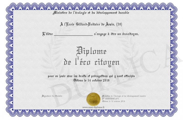 Envoyez par email votre Diplôme de l'éco citoyen personalisé