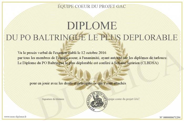 Envoyez par email votre Diplôme du PO Baltringue le plus déplorable personalisé