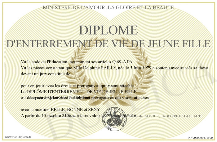 • Diplôme d'ENTERREMENT DE VIE DE JEUNE FILLE