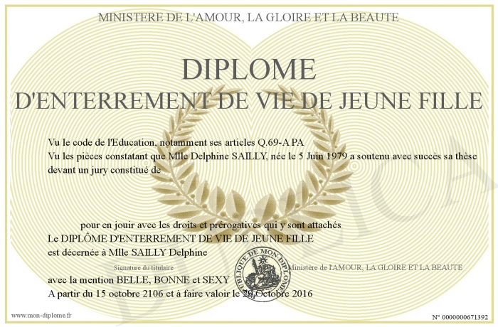 Envoyez par email votre Diplôme d'ENTERREMENT DE VIE DE JEUNE FILLE personalisé