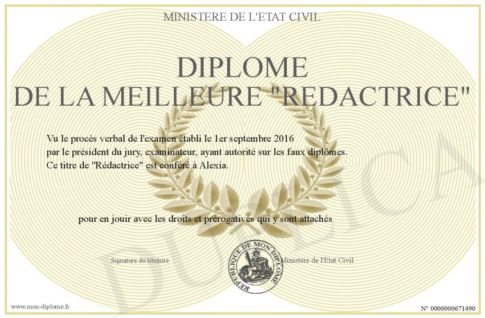 Envoyez par email votre Diplôme de la meilleure -rédactrice- personalisé