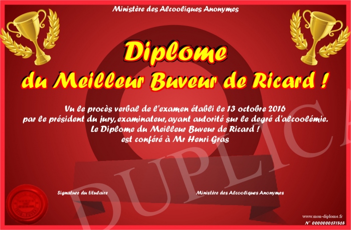 Envoyez par email votre Diplome du Meilleur Buveur de Ricard ! personalisé
