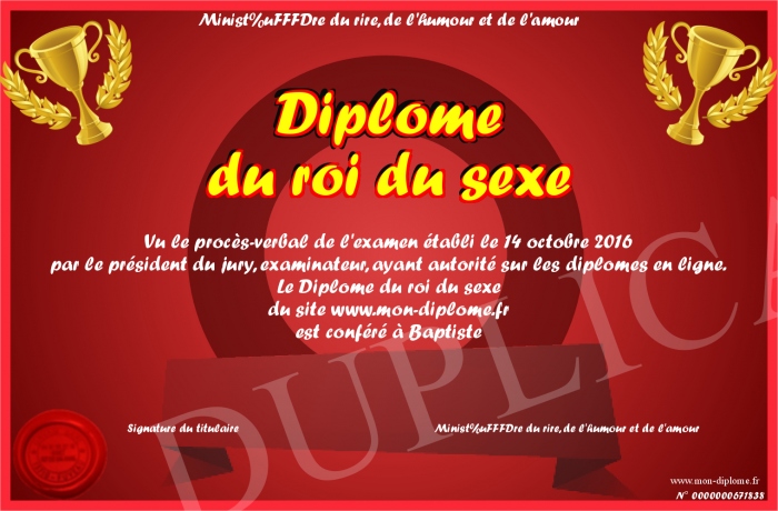 Envoyez par email votre Diplome du roi du sexe personalisé