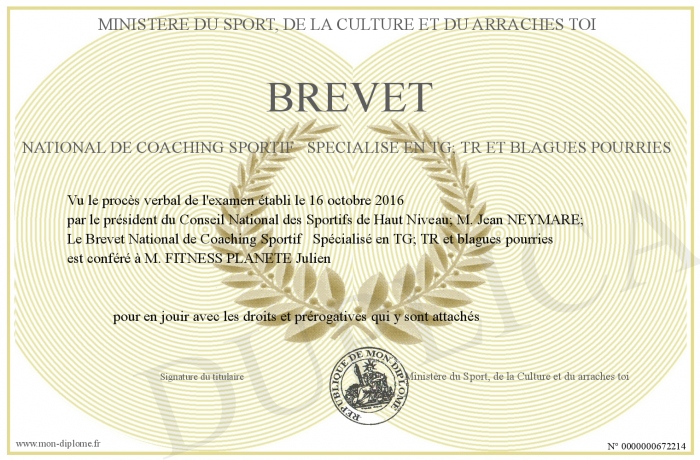 Envoyez par email votre Brevet National de Coaching Sportif Spécialisé en TG; TR et blagues pourries personalisé