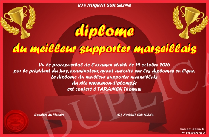 Envoyez par email votre diplome du meilleur supporter marseillais personalisé