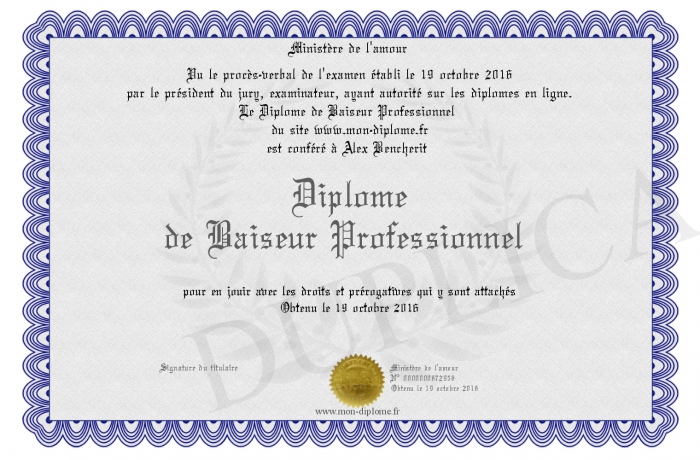 Envoyez par email votre Diplôme de Baiseur Professionnel personalisé