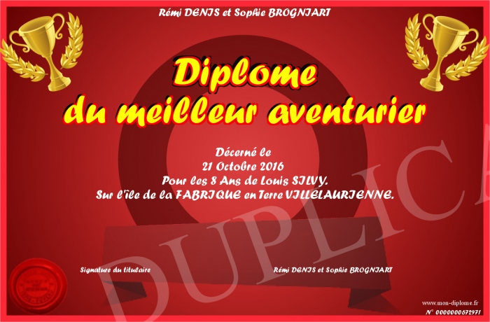 Envoyez par email votre Diplome du meilleur aventurier personalisé