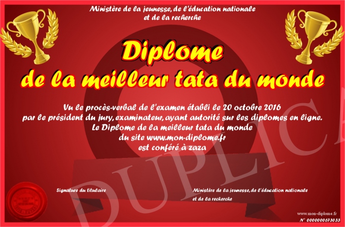 Envoyez par email votre Diplôme de la meilleur tata du monde personalisé