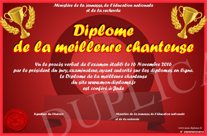 Envoyez par email votre Diplôme de la meilleure chanteuse personalisé