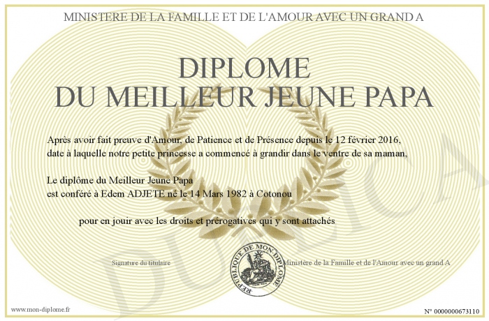 Envoyez par email votre Diplôme du meilleur jeune papa personalisé