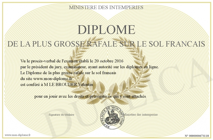 Envoyez par email votre Diplôme de la plus grosse rafale sur le sol francais personalisé
