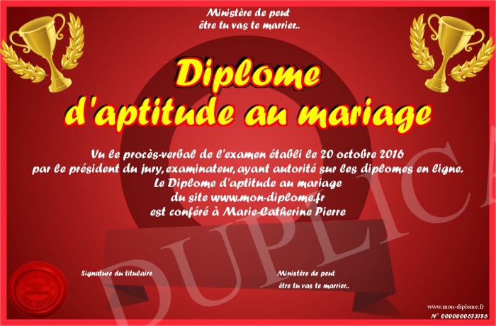 Envoyez par email votre Diplome d'aptitude au mariage personalisé