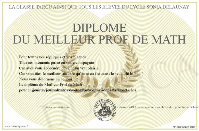 Envoyez par email votre DIPLOME DU MEILLEUR PROF DE MATH personalisé