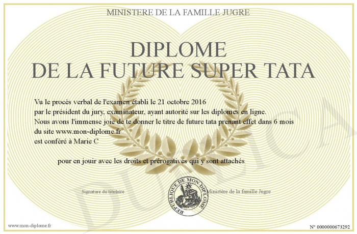 Envoyez par email votre Diplôme de la future super tata personalisé