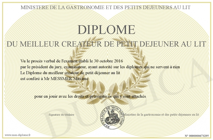 Envoyez par email votre Diplôme du meilleur créateur de petit déjeuner au lit personalisé