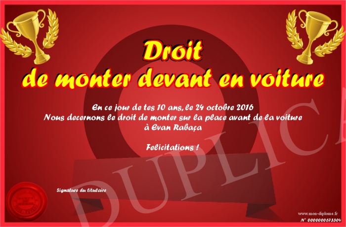 Envoyez par email votre Droit de monter devant en voiture personalisé