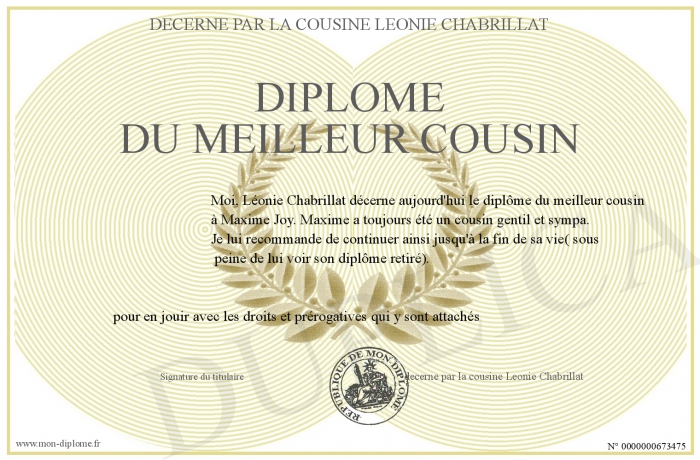 Envoyez par email votre Diplome du meilleur cousin personalisé