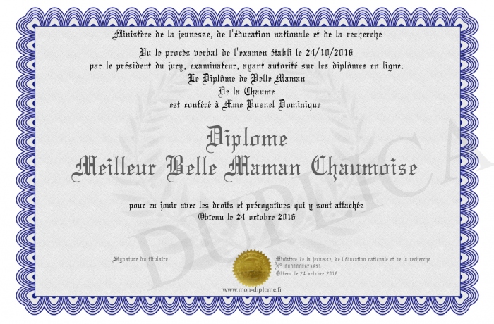 Envoyez par email votre Diplôme Meilleur Belle Maman Chaumoise personalisé