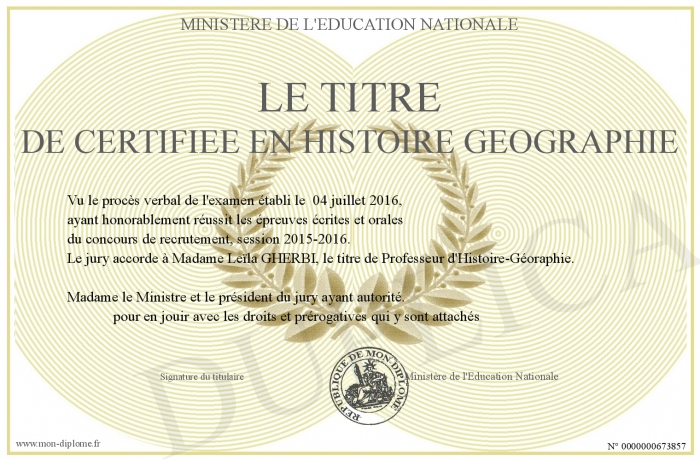 Envoyez par email votre le titre de Certifiée en Histoire Géographie personalisé