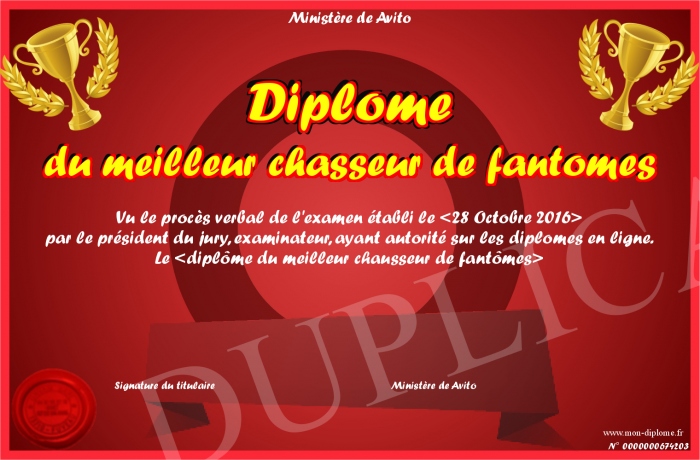 Envoyez par email votre Diplôme du meilleur chasseur de fantômes personalisé