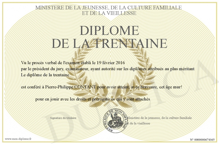 Envoyez par email votre Diplôme de la TRENTAINE personalisé