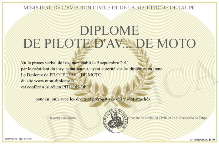 Envoyez par email votre Diplôme de PILOTE D'AV... DE MOTO personalisé