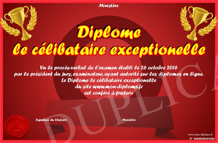 Envoyez par email votre Diplôme le célibataire exceptionelle personalisé
