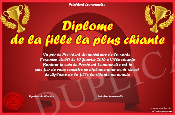 Envoyez par email votre Diplôme de la fille la plus chiante personalisé