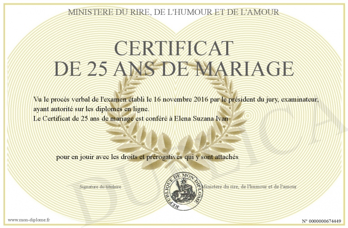 Envoyez par email votre Certificat de 25 ans de mariage personalisé