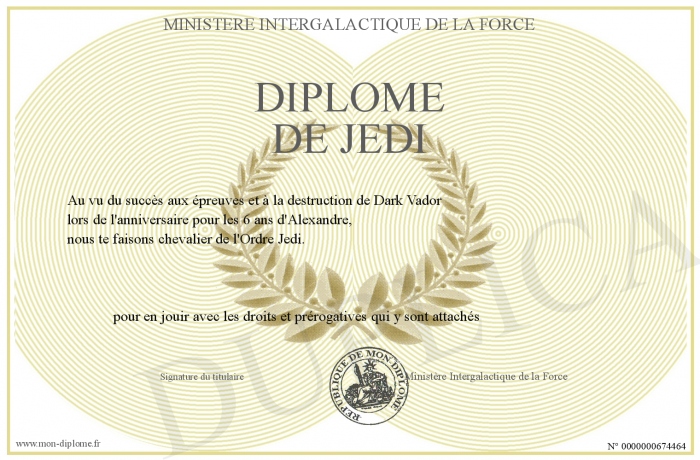 Envoyez par email votre Diplôme de Jedi personalisé