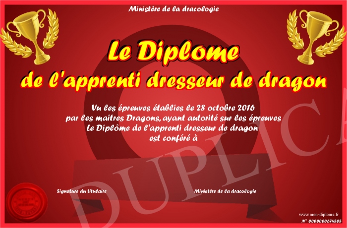Envoyez par email votre Le Diplôme de l'apprenti dresseur de dragon personalisé