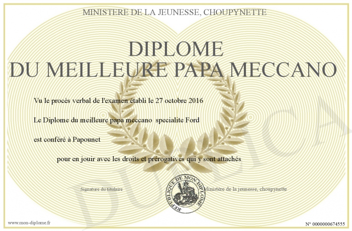 Envoyez par email votre Diplome du meilleure papa meccano personalisé