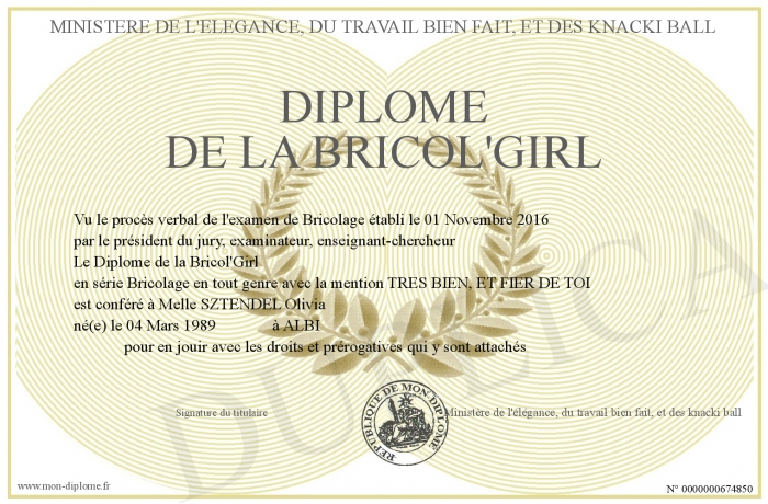 Envoyez par email votre Diplôme de la Bricol'Girl personalisé