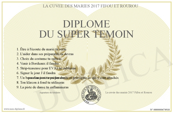 Envoyez par email votre Diplome du Super Témoin personalisé